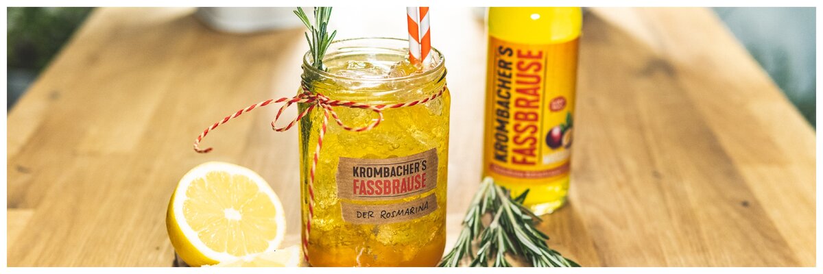 Du brauchst 1 cl Kräutersirup, 1 cl Zitronensaft, ½ Flasche Krombacher’s Fassbrause Maracuja und einen Rosmarinzweig.